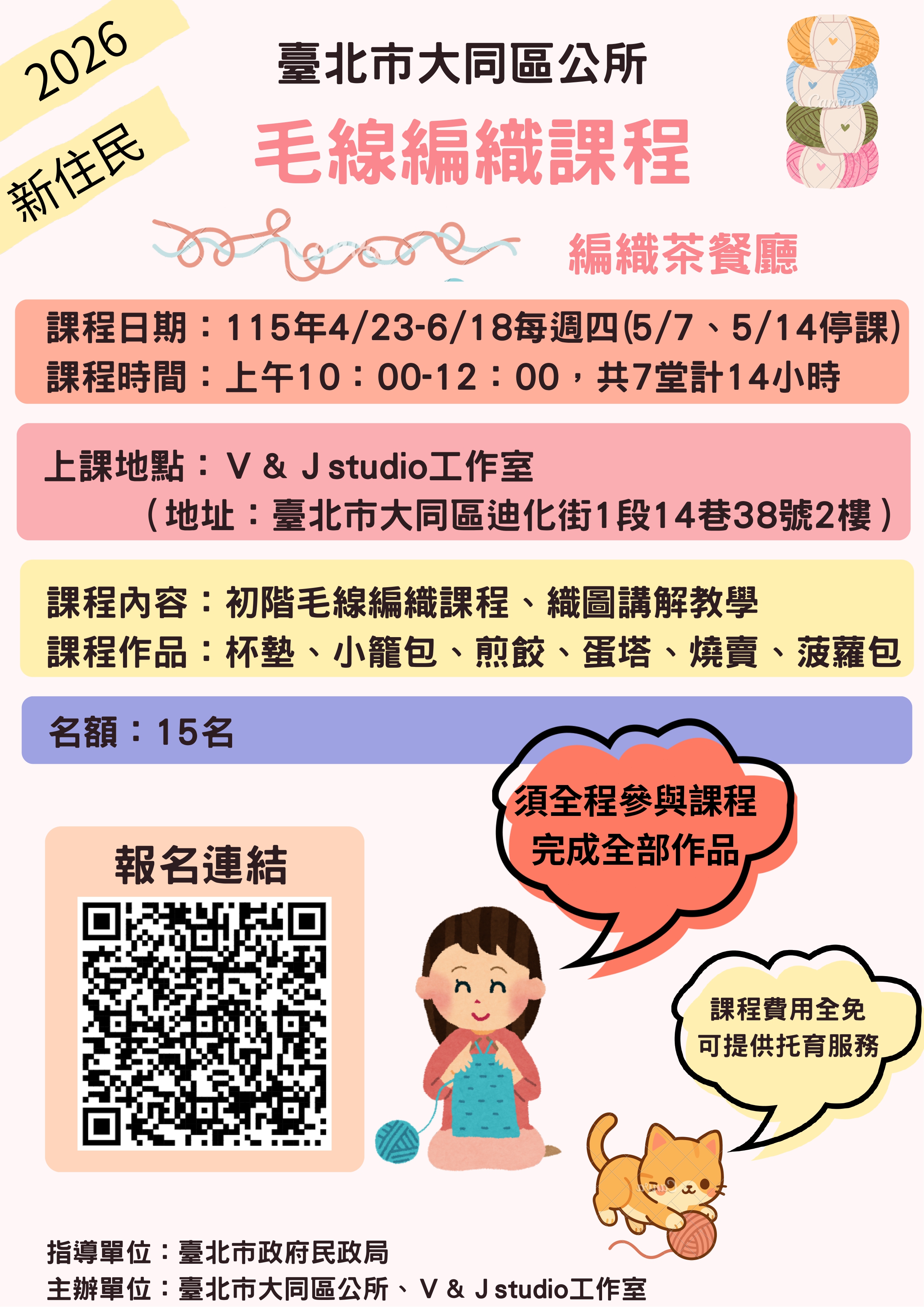「臺北市大同區公所開辦115年度新住民『毛線編織課程—編織茶餐廳』課程,
