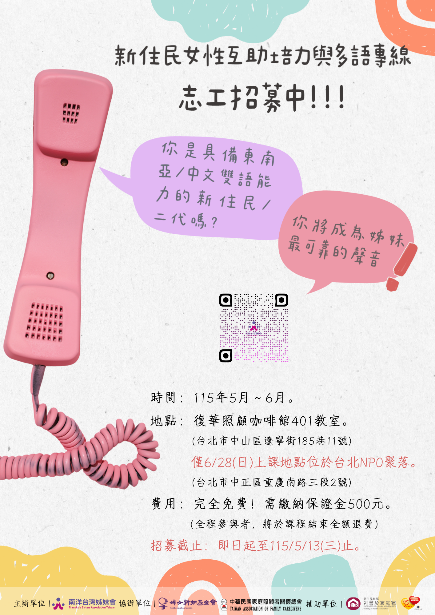 【轉知】南洋台灣姊妹會-新住民女性多語支持專線志工招募&培力
