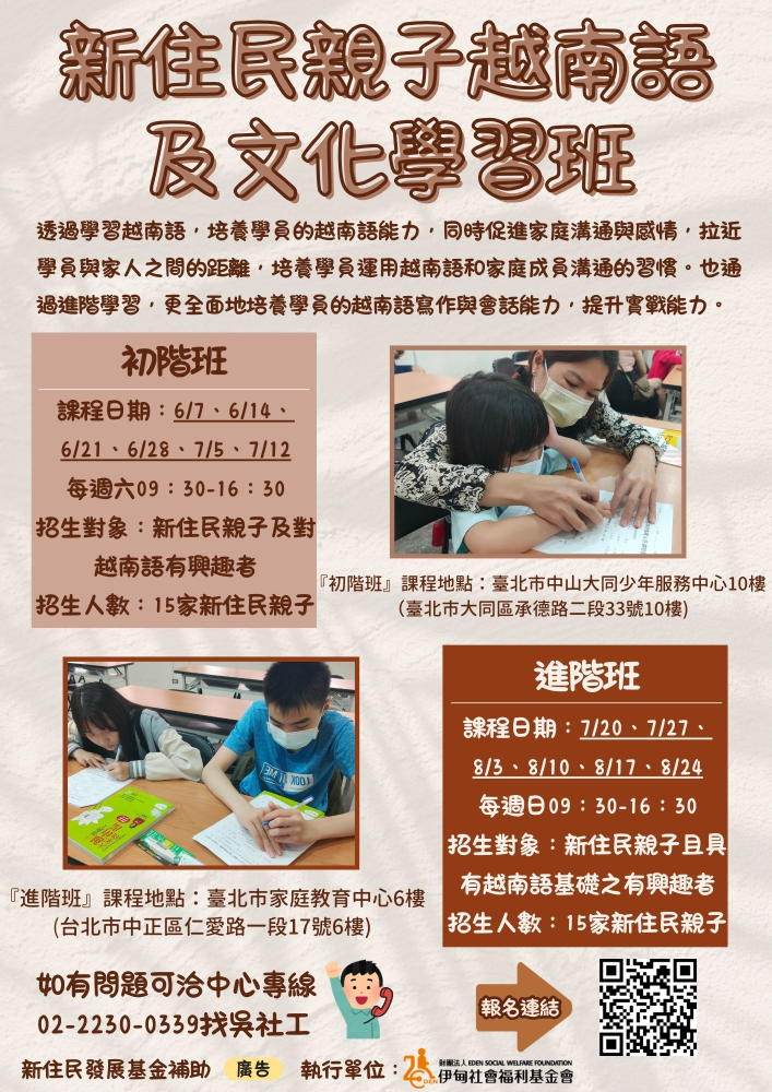 【轉知】伊甸新移民家庭成長中心-新住民親子越南語及文化學習班初、進階班