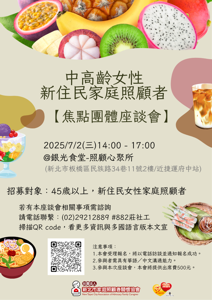 【轉知】新北市家庭照顧者關懷協會-中高齡女性新住民家庭照顧者-焦點團體座談會