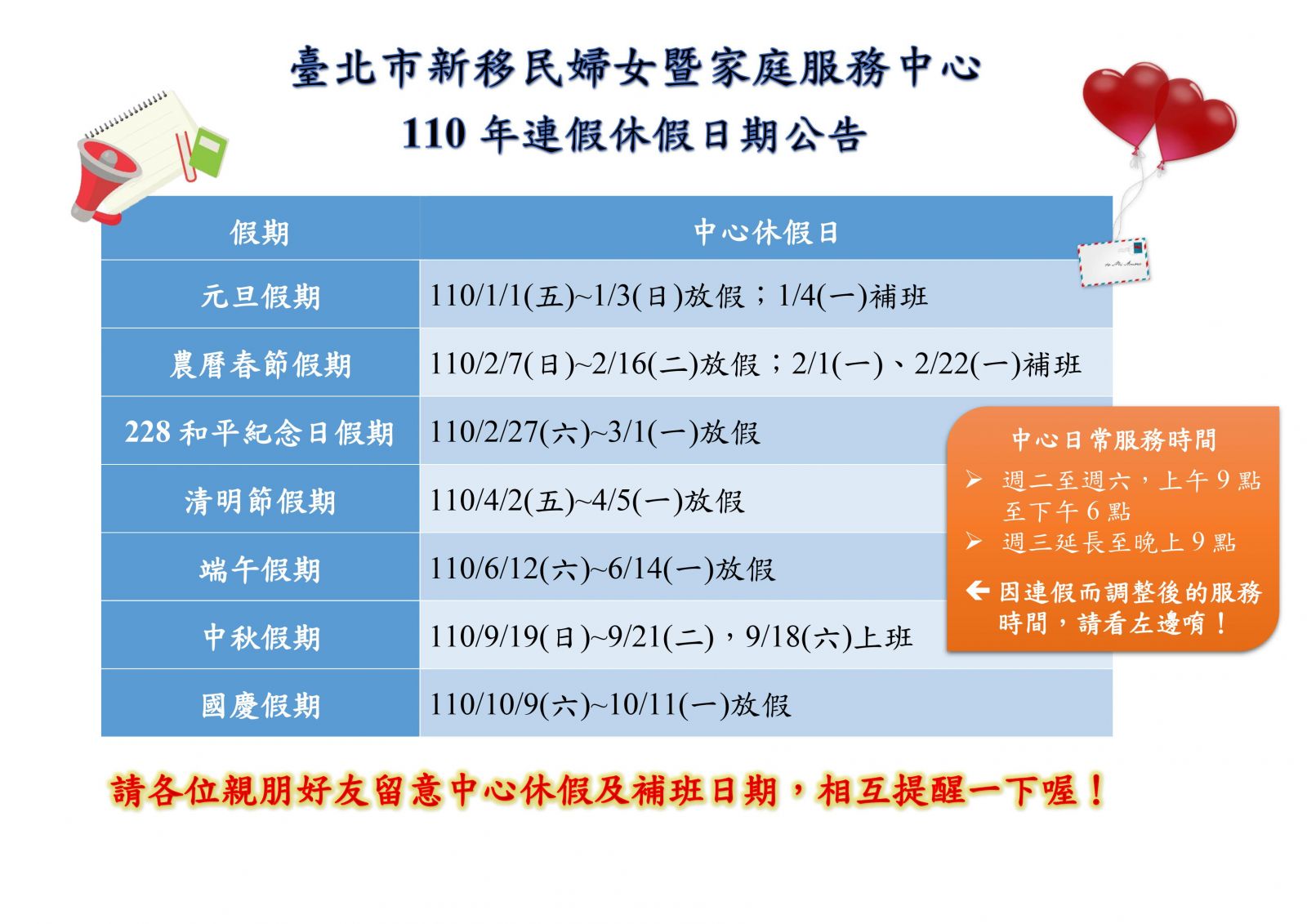 中心服務時間:週二~週六 09:00~18:00 (週三延長至晚上9點)