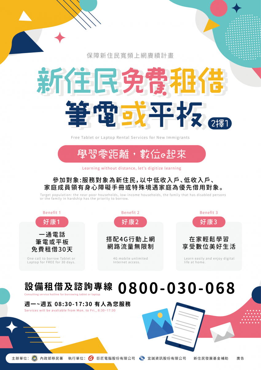 只要符合新住民身分者,撥打諮詢專線0800-030-068完成預約或至服務站洽詢,平板電腦或筆記型電腦立即宅配到府,並享有每月4G吃到飽行動網路。