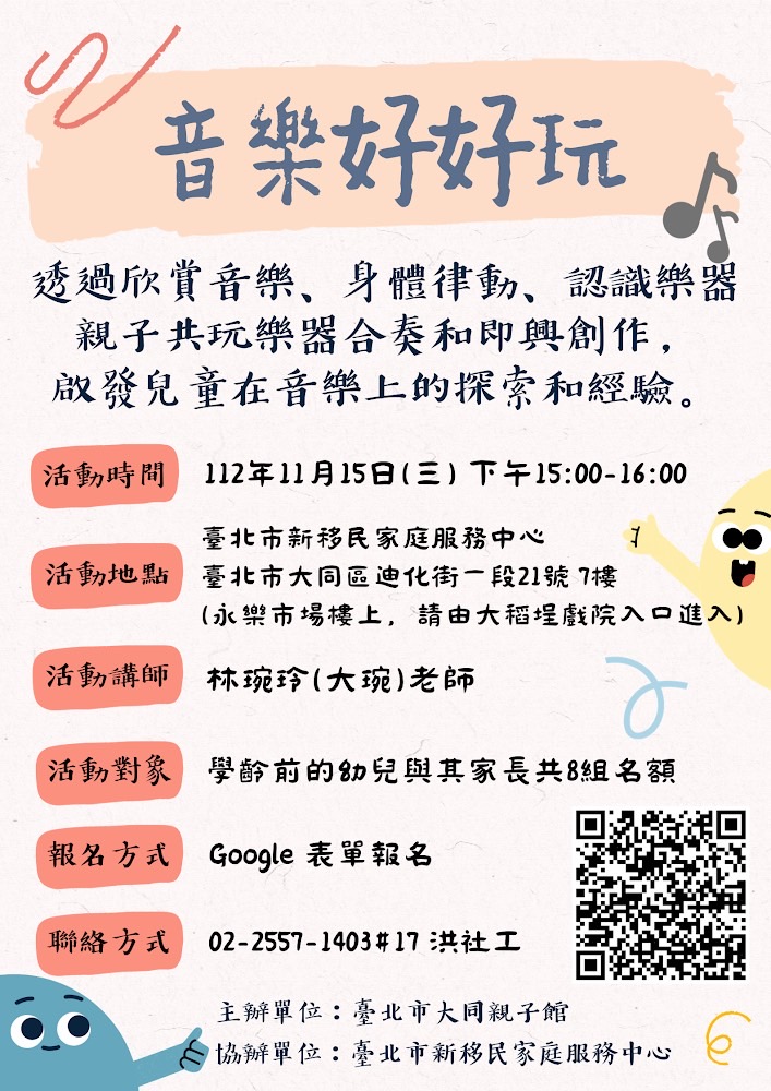 ※活動對象:學齡前親子至多8組,以設籍或實際居住臺北市之新移民家庭優先參加
