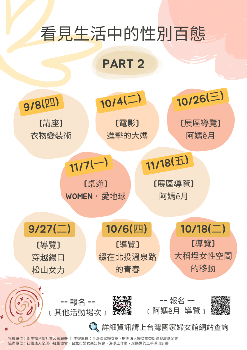 社家署委託財團法人婦女權益促進發展基金會經營台灣國家婦女館,致力臺灣性別平等運動及政府政策推廣,該館今年將透過影片、對談講座及實地導覽方式,透過親自聆聽他/她們的故事,開拓參與者之性別視角。