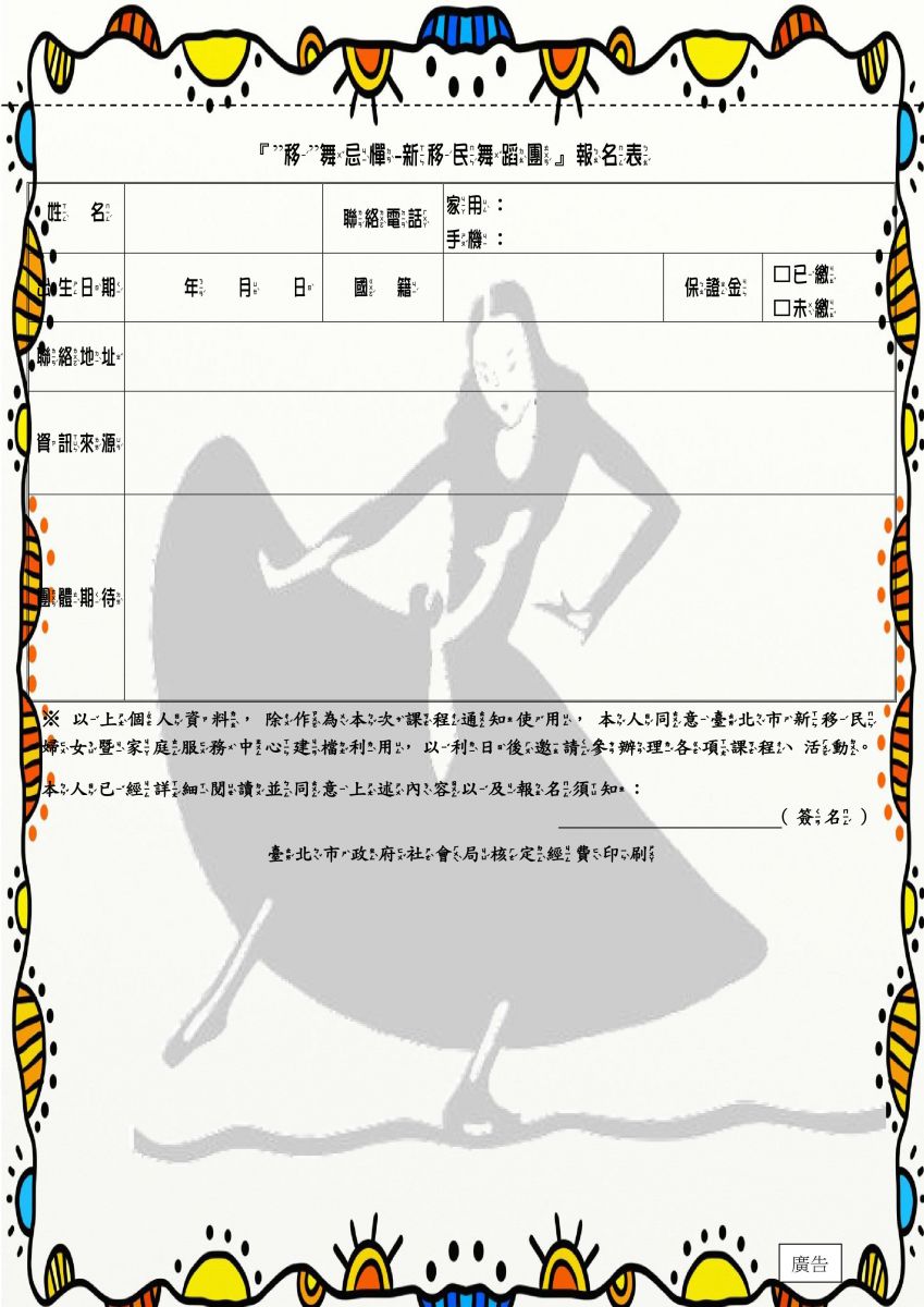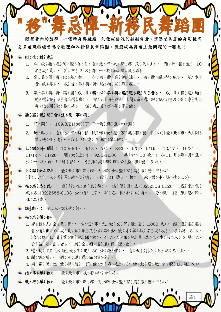 1.以設籍或實際居住臺北市之新移民為主,預計招生10名成員,其中2名為一般社區民眾。