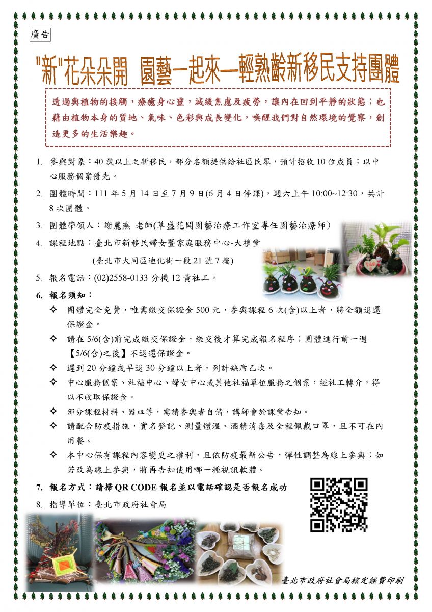 *報名方式:請掃QR CODE報名並以電話確認是否報名成功(02)2558-0133分機12黃社工