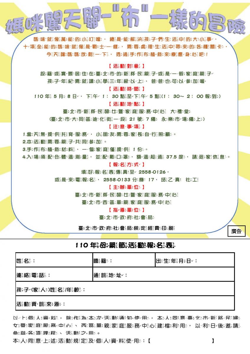 【活動地點】臺北市新移民婦女暨家庭服務中心 大禮堂(臺北市大同區迪化街一段21號7樓 永樂市場樓上)