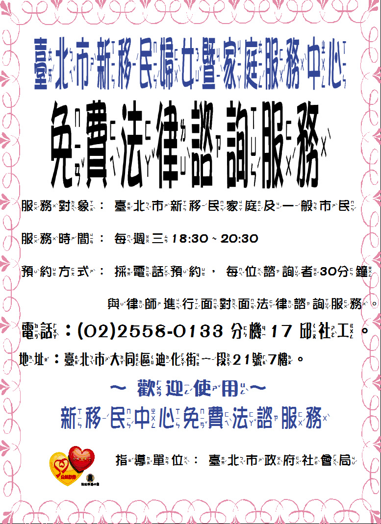 臺北市新移民中心由專業律師每週三定期提供免費面對面法律諮詢服務,如: 婚姻、監護權、財產分配、債權債務...等相關法律問題。
