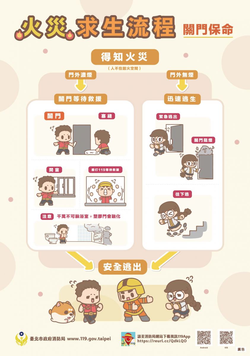 發現火災,請保持冷靜,迅速遠離火源。小火快跑,濃煙關門。逃生動線上若無濃煙,請立即向一樓逃生;如發現濃煙,應立即關門以防止火勢及煙霧侵入,尋找安全空間就地避難,並立即撥打119報案。