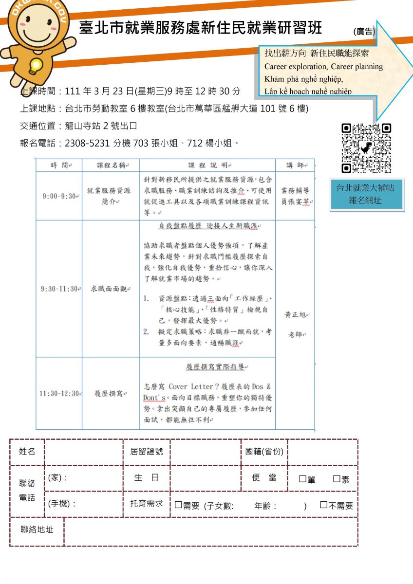 【轉知】臺北市就業服務處新住民就業研習班