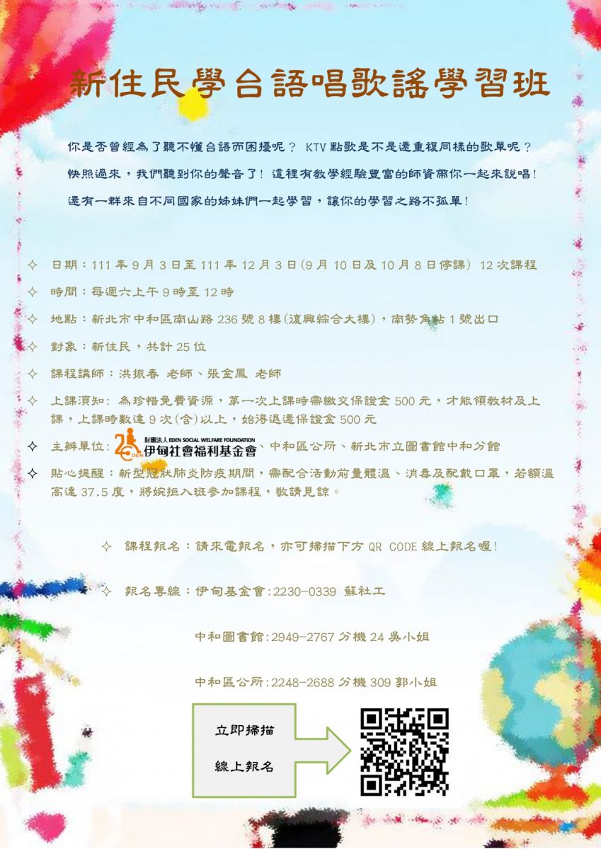 【轉知】伊甸基金會新移民家庭成長中心-111年伊甸基金會台語歌謠班招生囉!