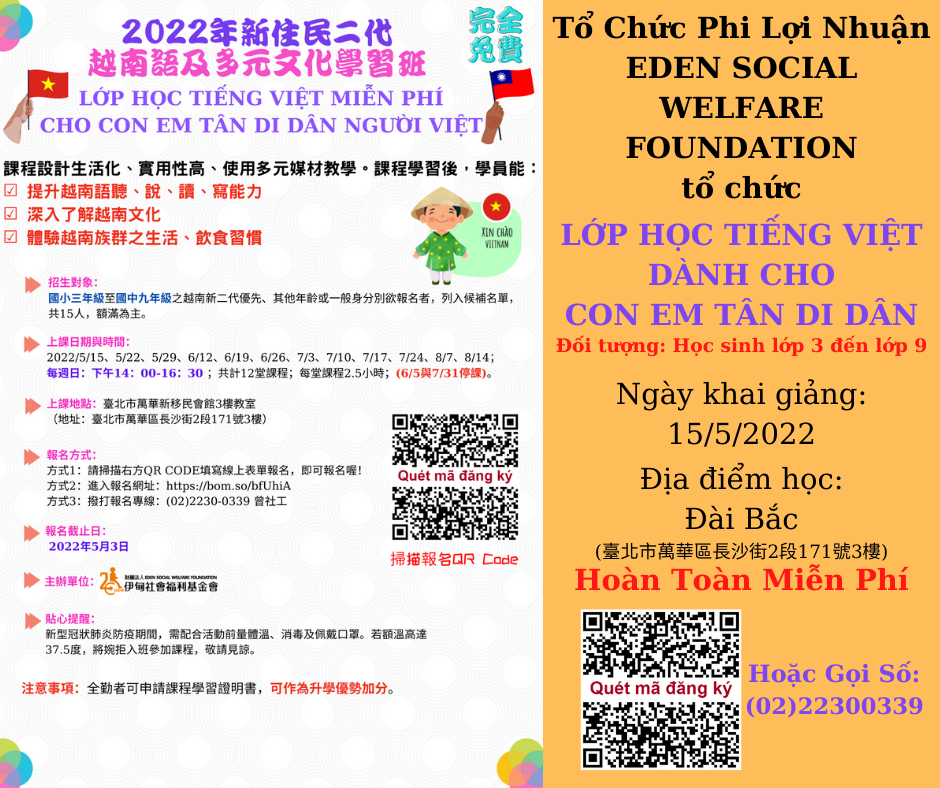 【轉知】越南語及多元文化學習班於5/15開學咯