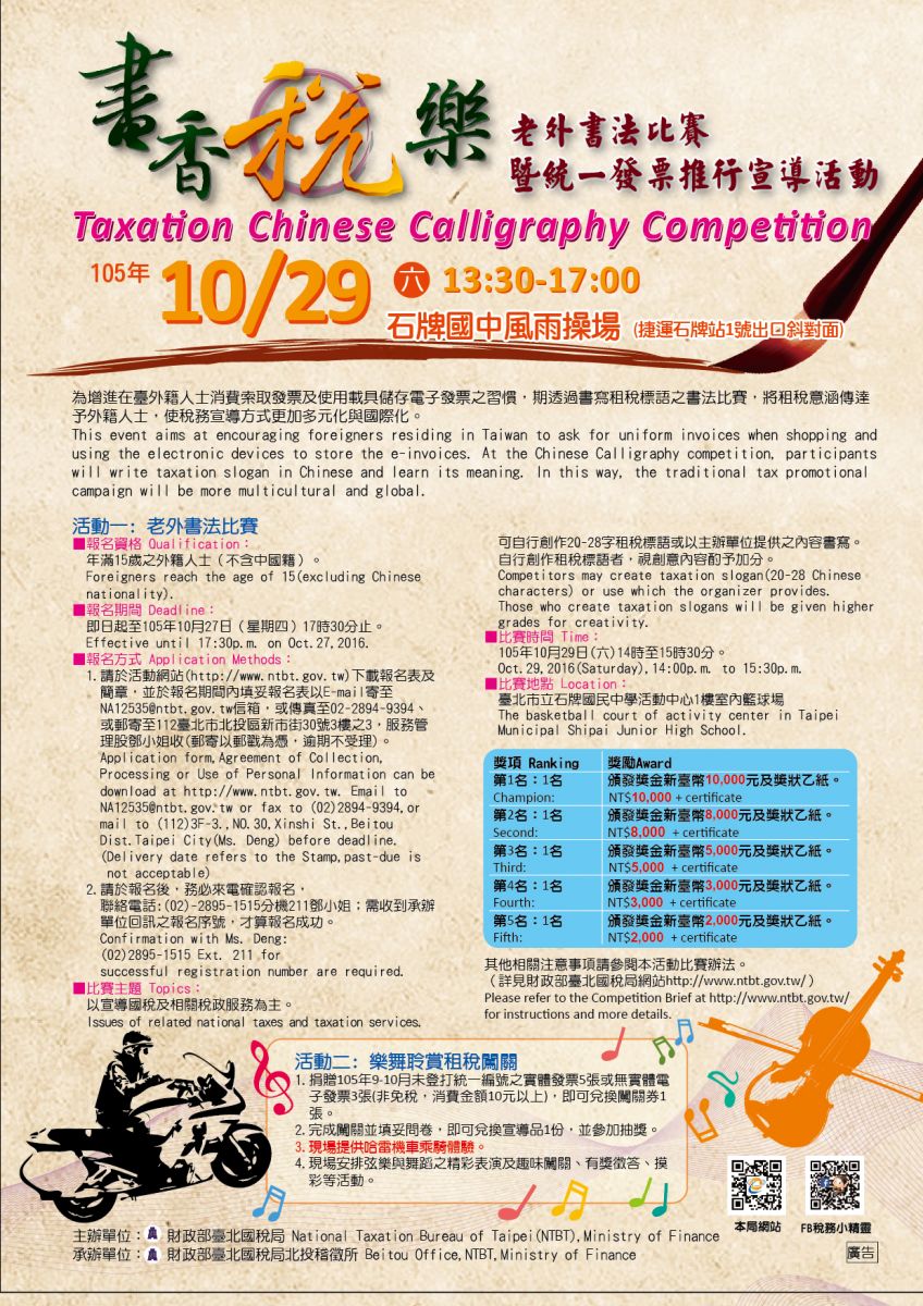 105年10月29日「書香稅樂」老外書法比賽暨統一發票推行宣導活動,透過書寫租稅標語之書法比賽,使稅務宣導方式更加多元化與國際化。