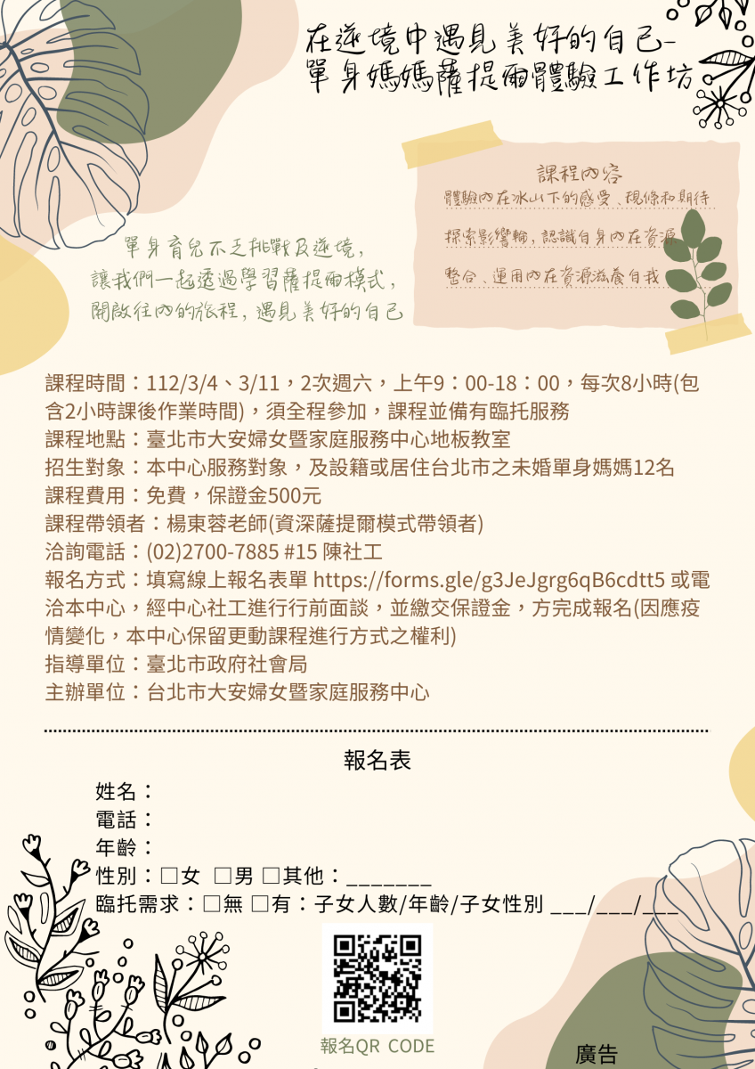 【轉知】112年大安婦女中心「在逆境中遇見美好的自己- 單身媽媽薩提爾體驗工作坊」熱烈招生中