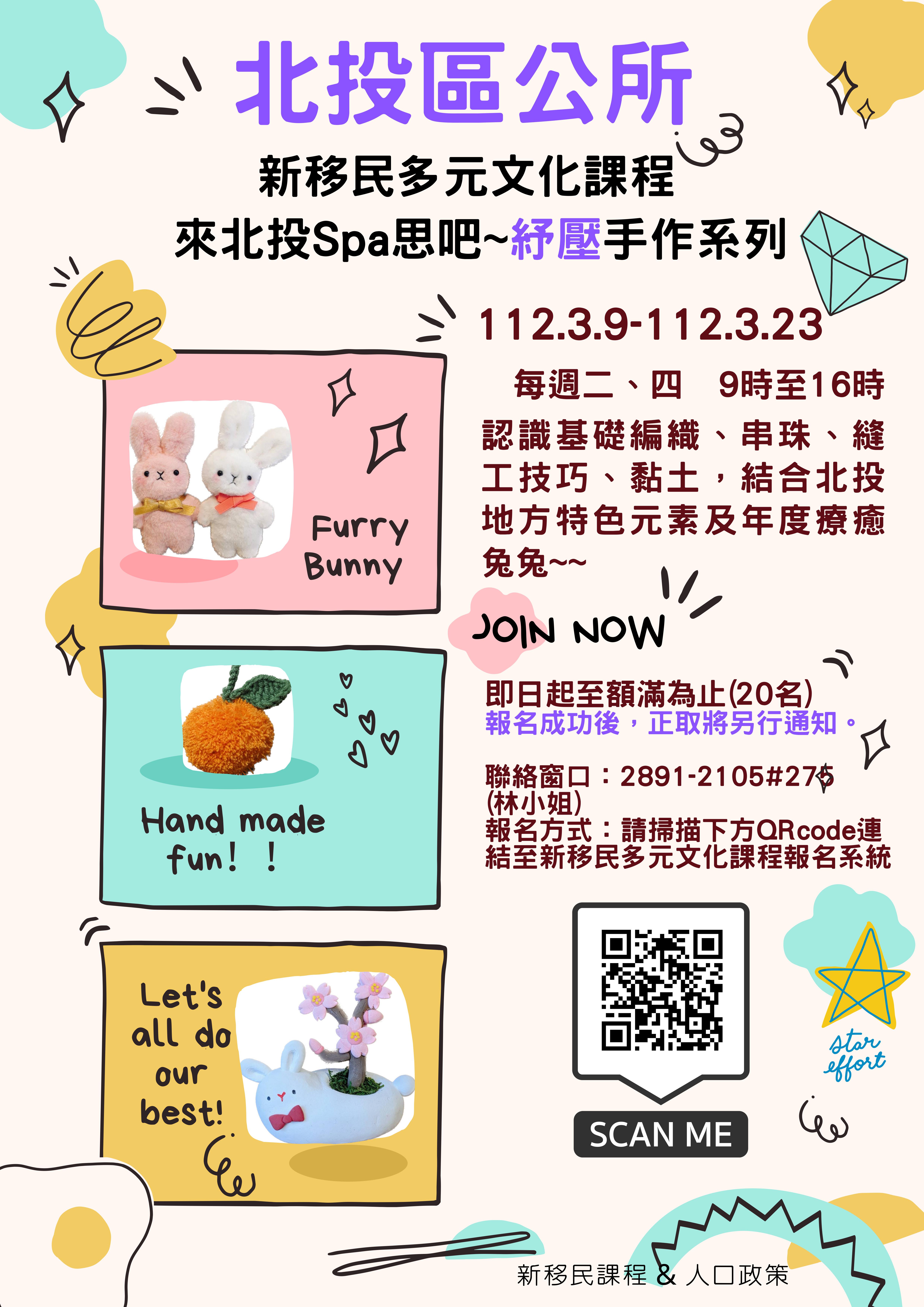 【轉知】北投區公所-112年新移民多元文化課程來北投Spa思吧紓壓系列手作