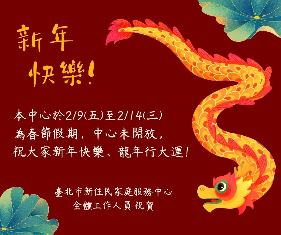 【中心公告】本中心於2/9(五)至2/14(三)為春節假期,中心未開放,祝福大家新年快樂、龍年行大運!