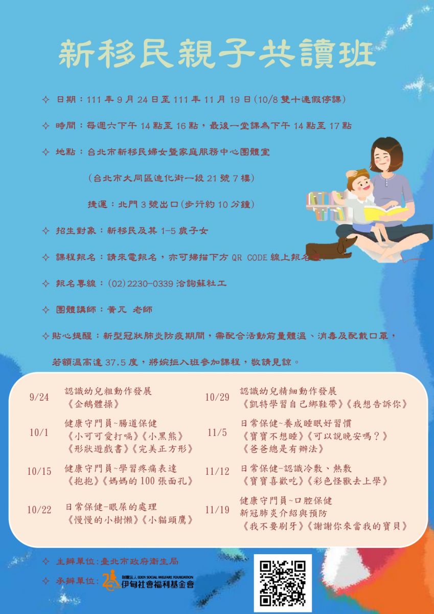 地點:台北市新移民婦女暨家庭服務中心(臺北市大同區迪化街一段21號7樓)