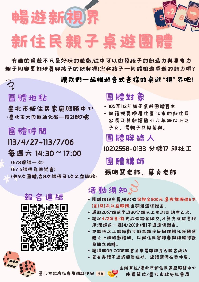 2.設籍或實際居住在臺北市的新住民家長及其就讀國小六年級以上之子女,需親子共同參與。