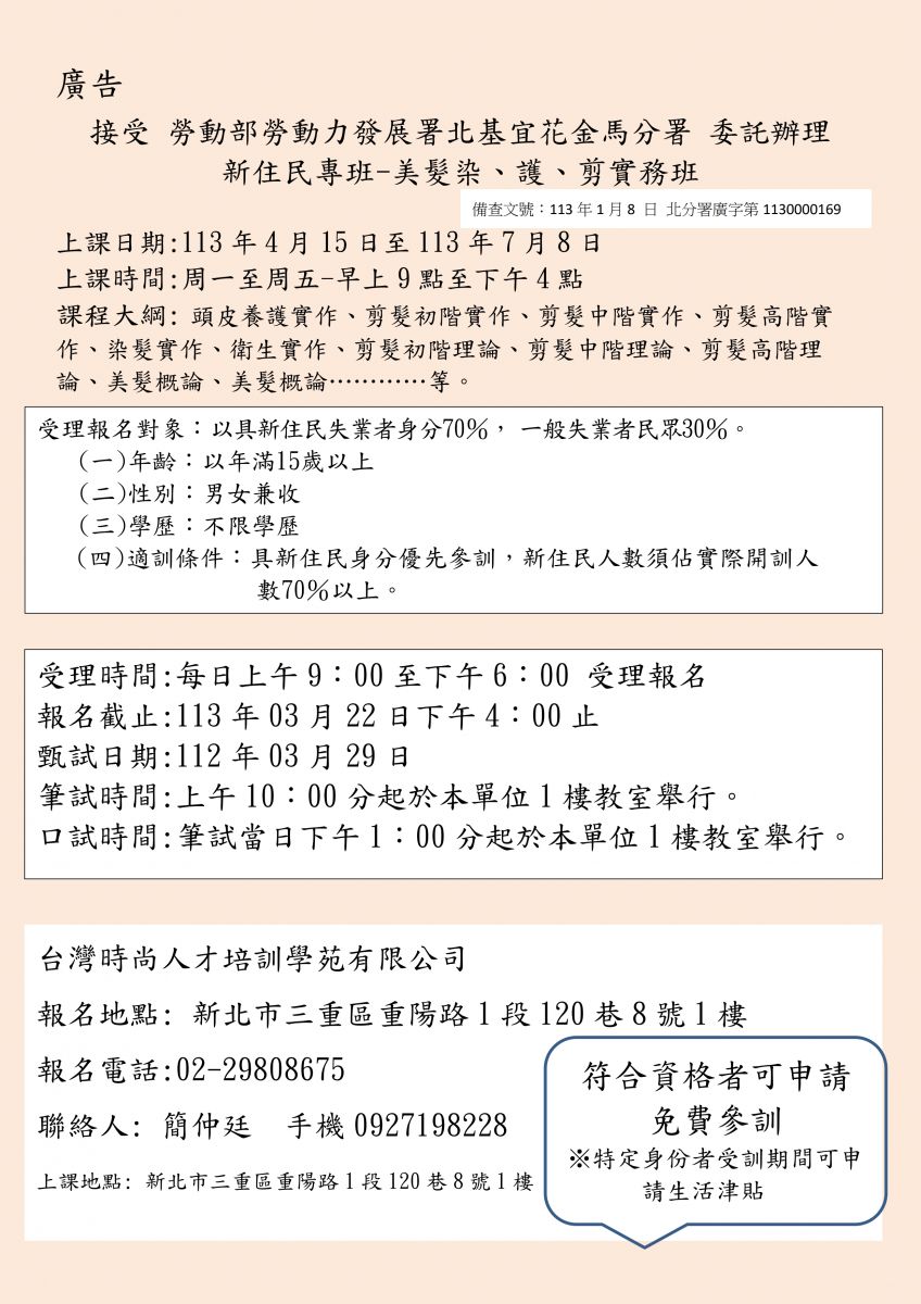 【轉知】台灣時尚人才培訓學苑有限公司接受 勞動部勞動力發展署北基宜花金馬分署 委託辦理~「新住民專班-美髮染、護、剪實務班」