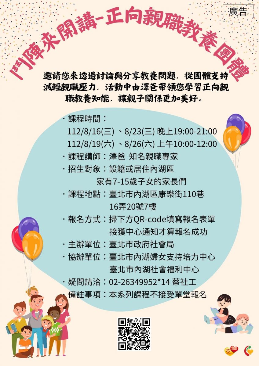 【轉知】內湖婦女支持培力中心-鬥陣來開講-正向教養親職團體