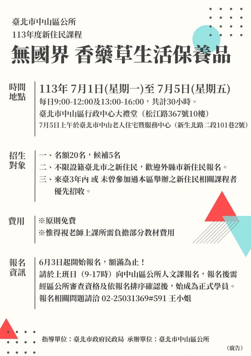 【轉知】中山區公所新移民課程-無國界 香藥草生活保養品