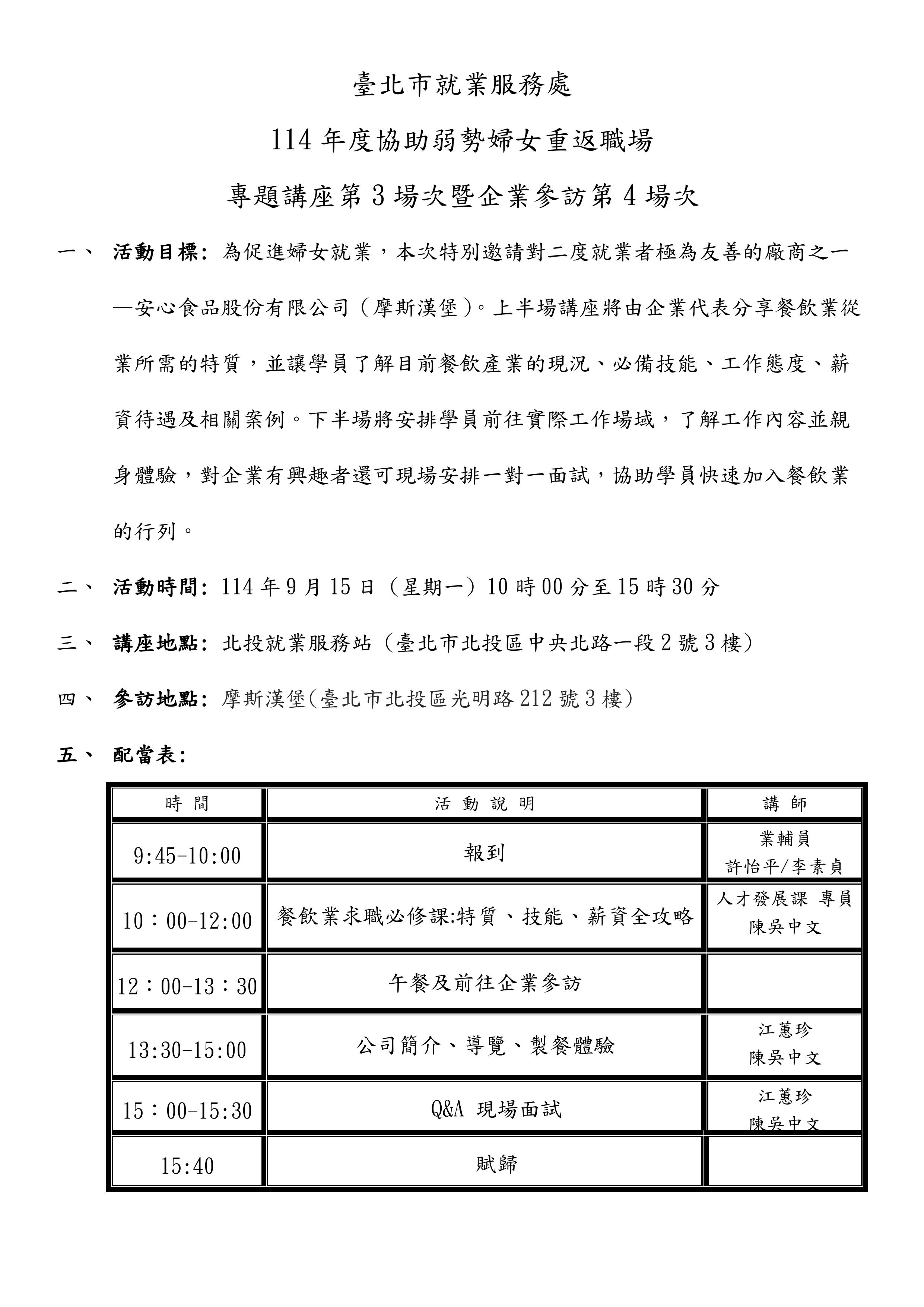 【轉知】臺北市就業服務處114年度「促進弱勢就業婦女就業服務計畫」第3場次專題講座暨第4場次企業參訪