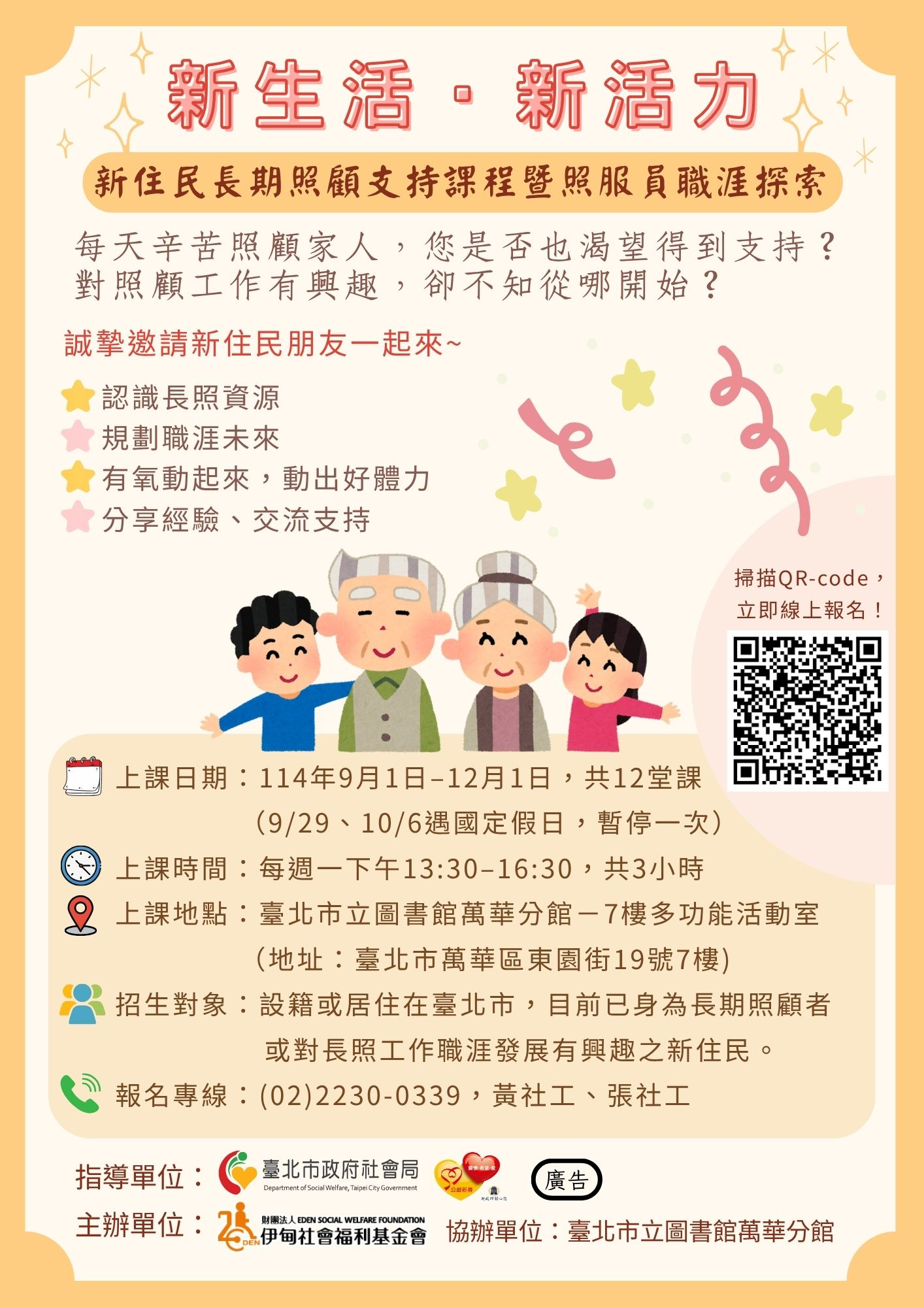 陪你一起認識長照資源、規劃職涯未來,還有輕鬆有氧活動與溫暖交流!