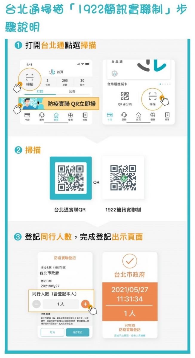 搭配1922簡訊實聯制,台北通防疫,自主掃描步驟說明請參考圖檔內容