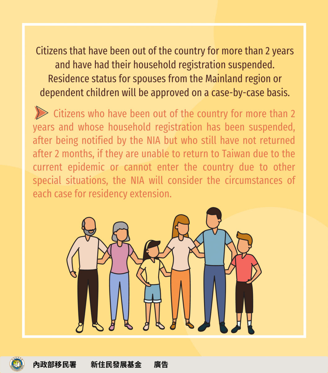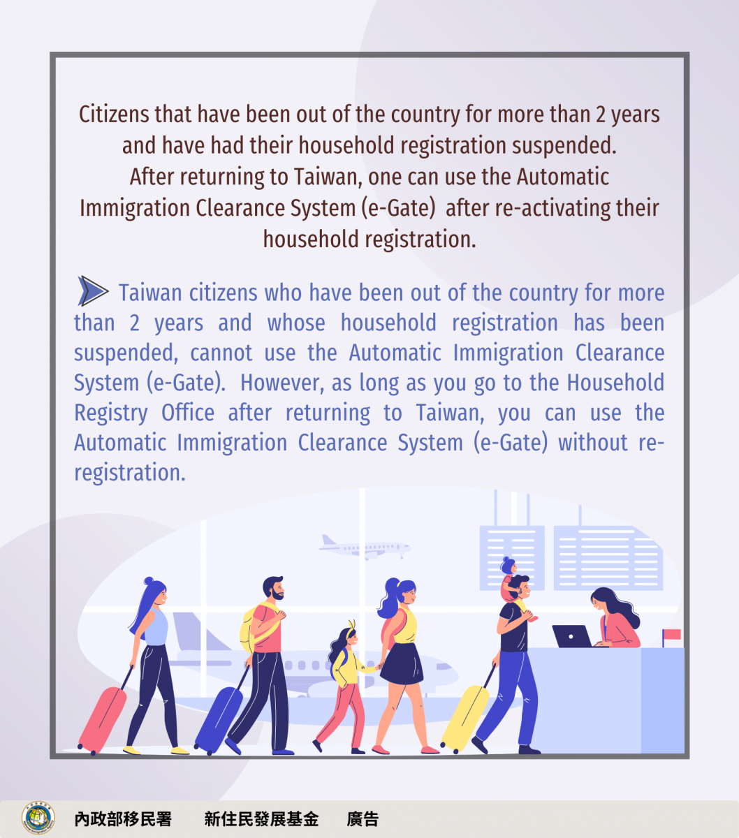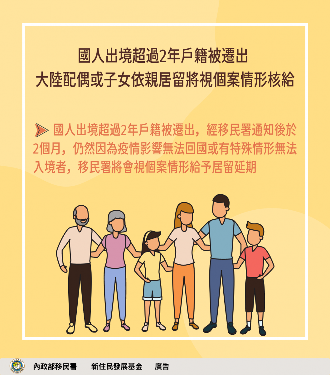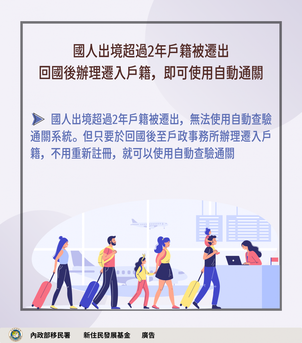 有關國人出境逾2年其戶籍遭致遷出,經移民署通知後2個月內仍未入境,其大陸配偶或其子女將視情況予以居留延期。 另外有關國人戶籍遭遷出,雖遷出期間無法使用自動通關,惟戶籍遷入後無須重新註冊,即可使用自動通關。