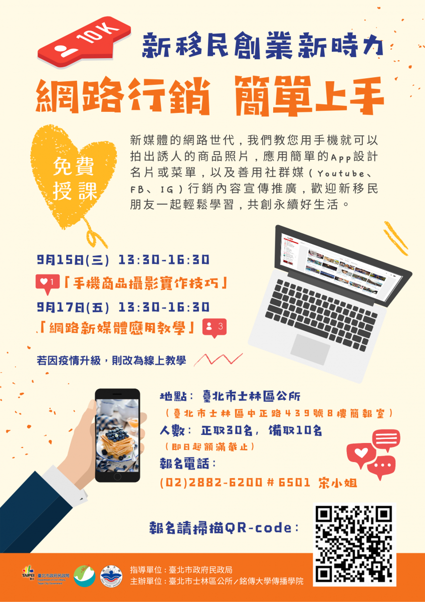 防疫不停學~士林區公所110年新移民創業新時力-網路行銷簡單上手課程,熱情招生中,歡迎新移民朋友踴躍報名參加!!!名額有限,請儘速報名
