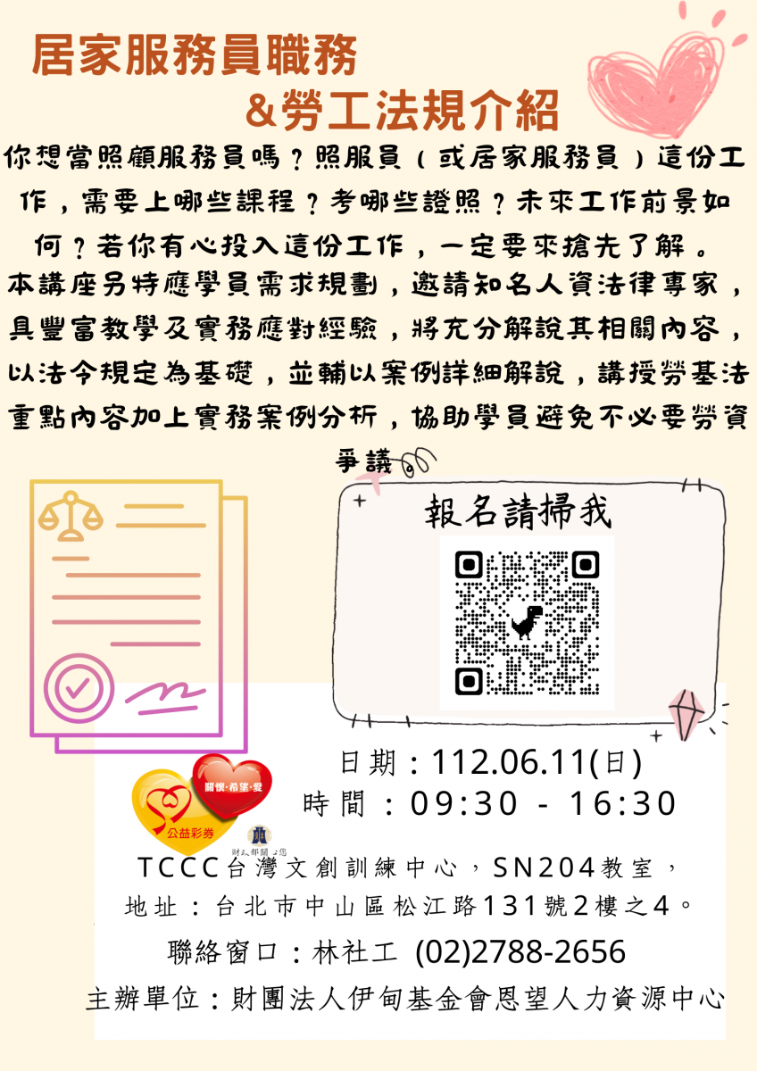 【轉知】財團法人伊甸基金會恩望人力資源中心-112/6/11辦理居家服務員職務及勞工法規介紹講座