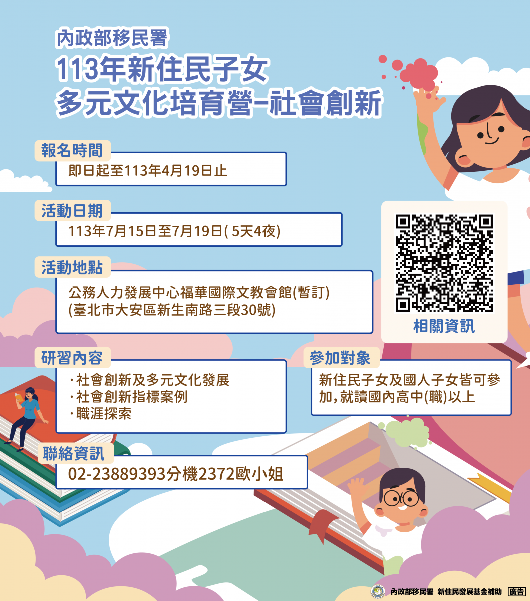 【轉知】內政部移民署-113年新住民子女多元文化培育營-社會創新