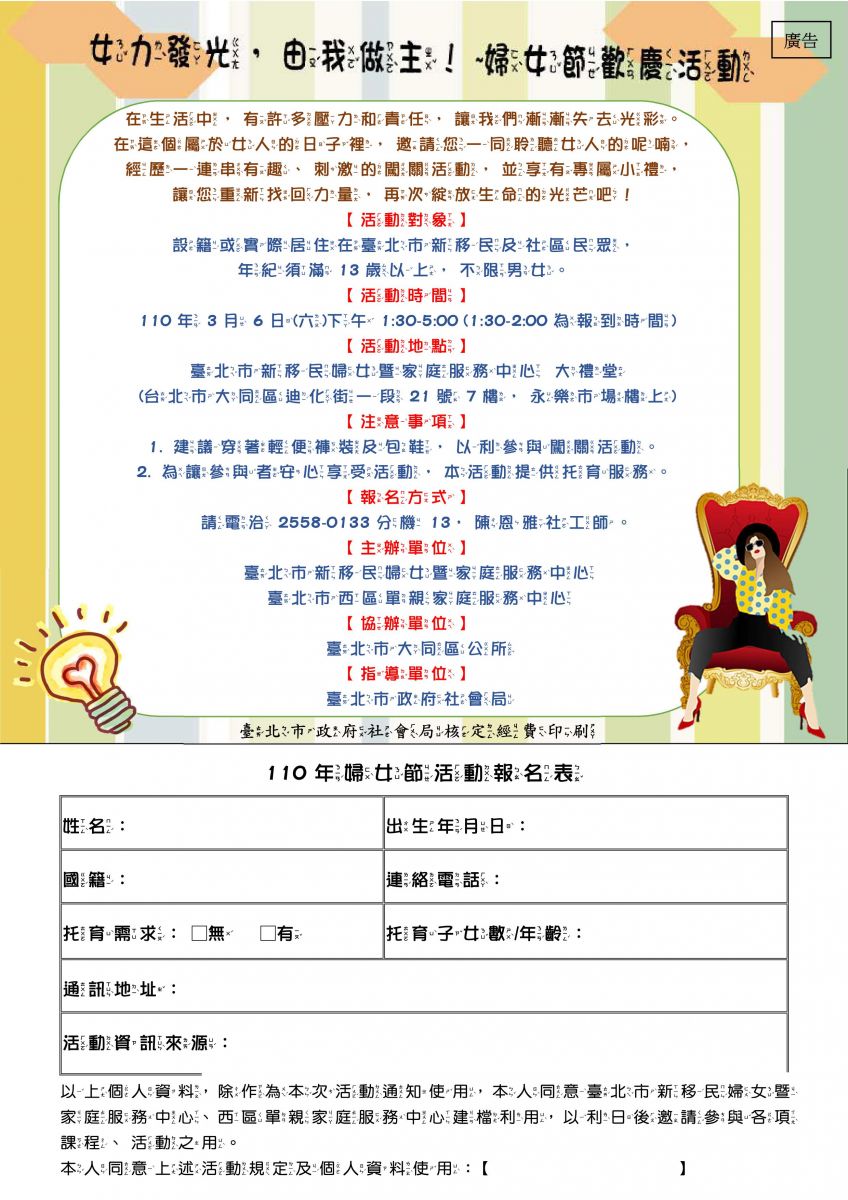 本中心於3/6(六)13:30-17:00舉辦婦女節活動”女力發光,由我做主!”