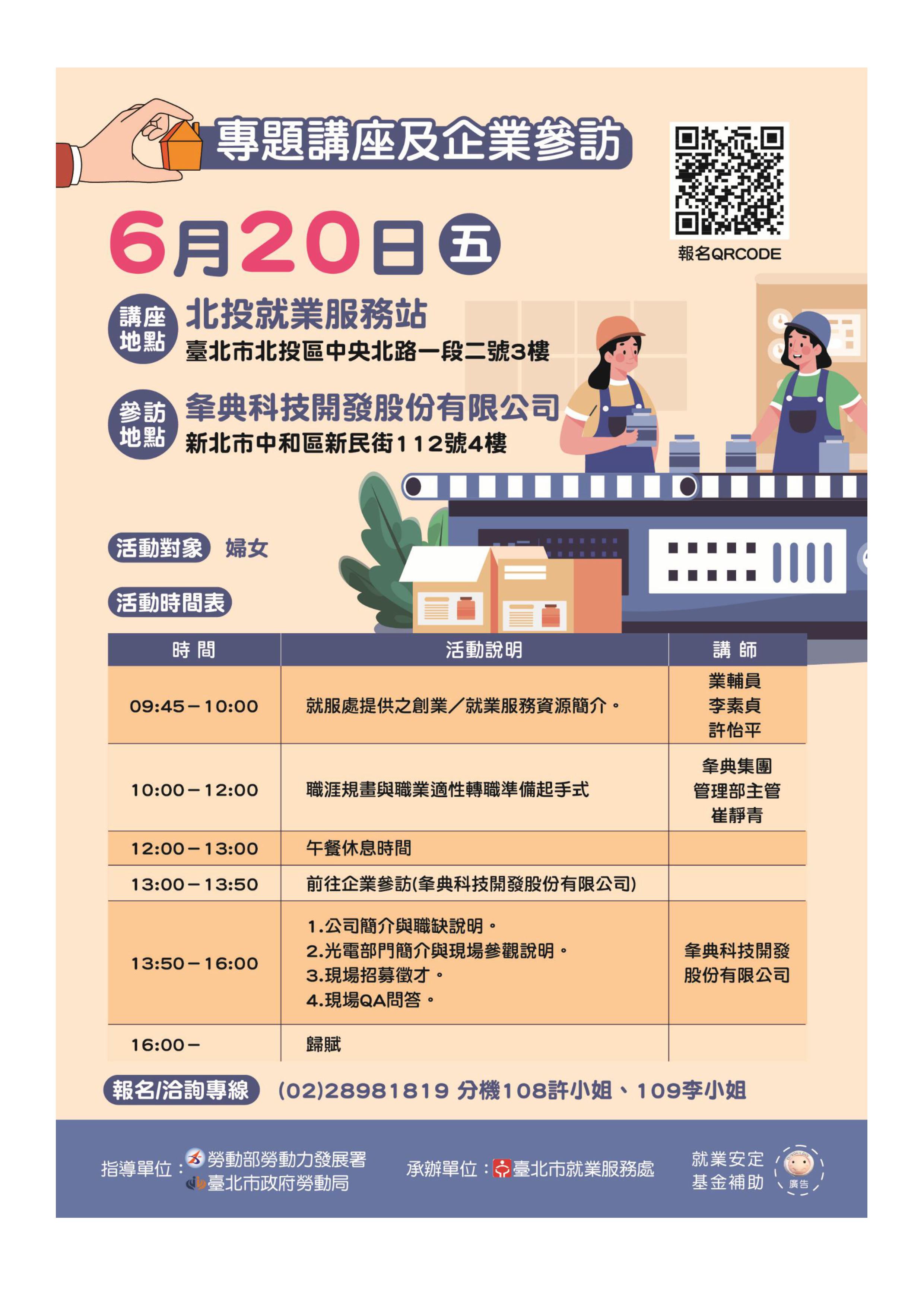 本次專題講座及企業參訪邀請「夆典科技開發股份有限公司」,上半場專題講座先行討論職涯規畫與職業適性分析,下半場將實地到企業參訪,讓婦女實地了解製造業中各部門實際運作與工作型態,有助釐清職涯方向。