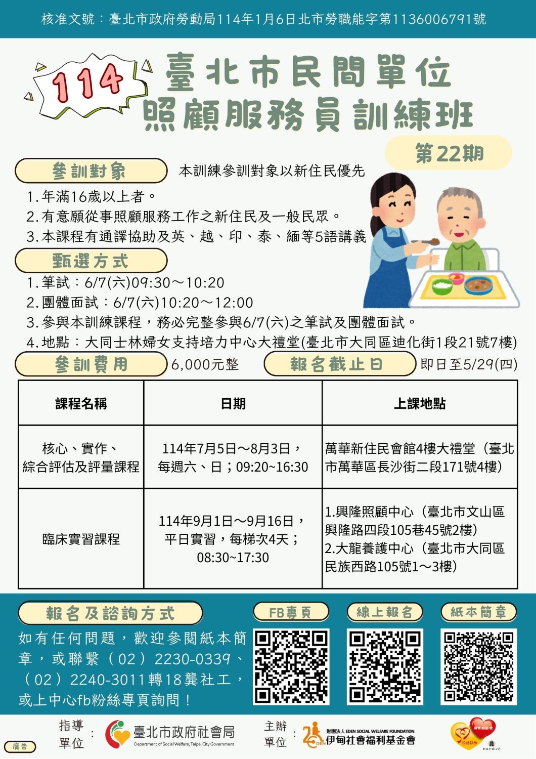 【轉知】伊甸新移民家庭成長中心-臺北市民間單位照顧服務員訓練班第22期