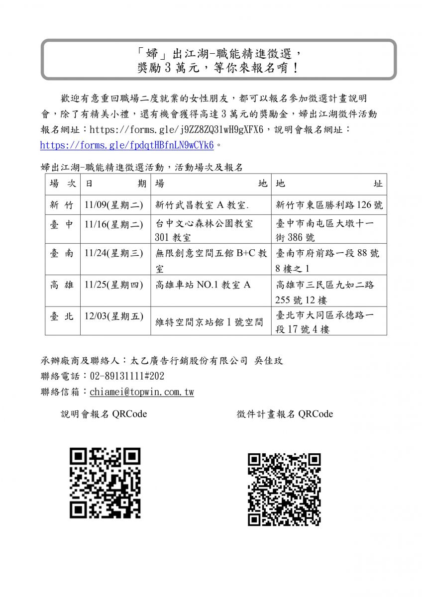 【轉知】勞動部勞動力發展署「婦出江湖 職能精進 徵選獎勵計畫」(詳附件),歡迎鼓勵欲重返職場之婦女報名參加,如獲徵選,可獲獎金3萬元!!!
