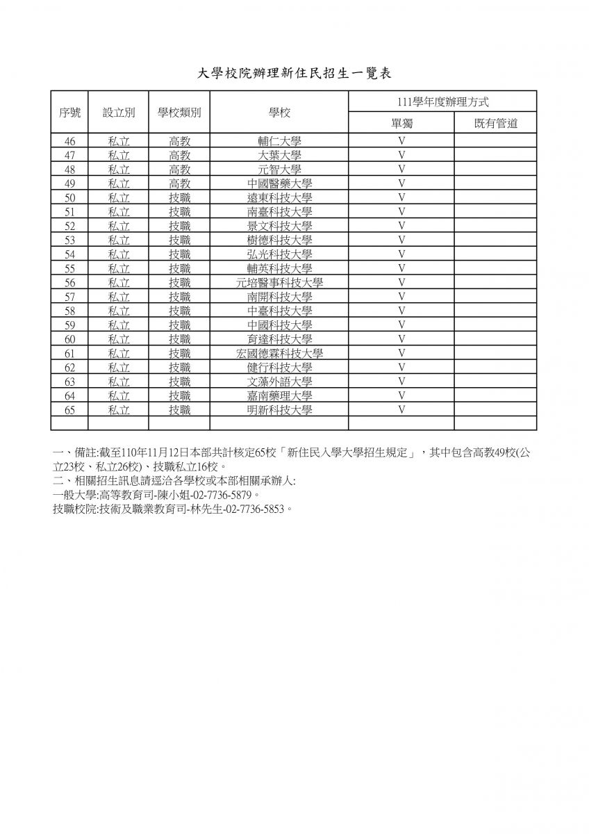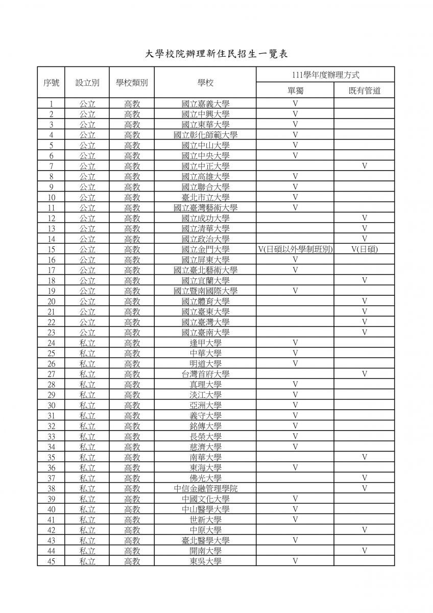 【轉知】教育部大學校院辦理新住民招生一覽表,請鼓勵符合入學資格之新住民踴躍報名申請就讀大學
