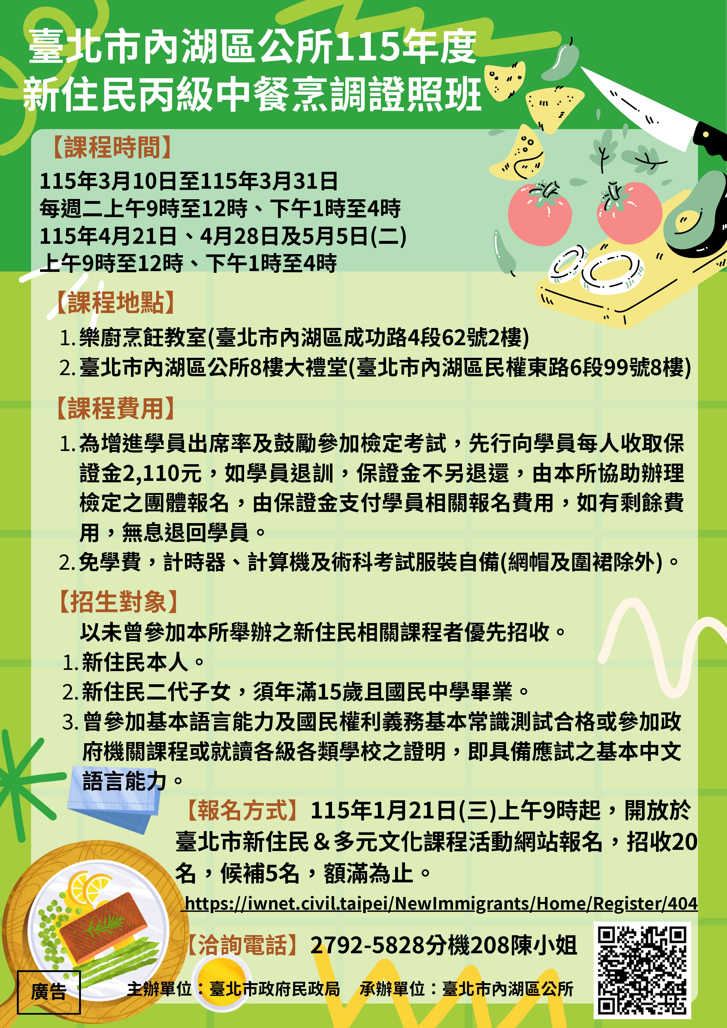 【轉知】臺北市內湖區公所-新住民丙級中餐烹調證照班