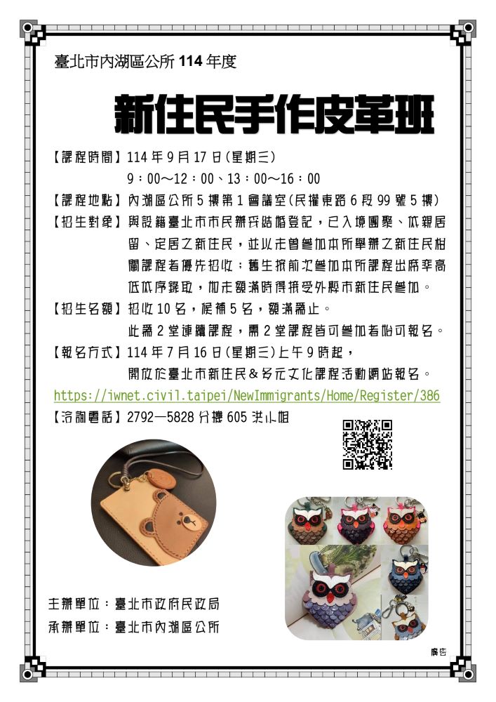 【轉知】臺北市內湖區公所-新住民手作皮革班