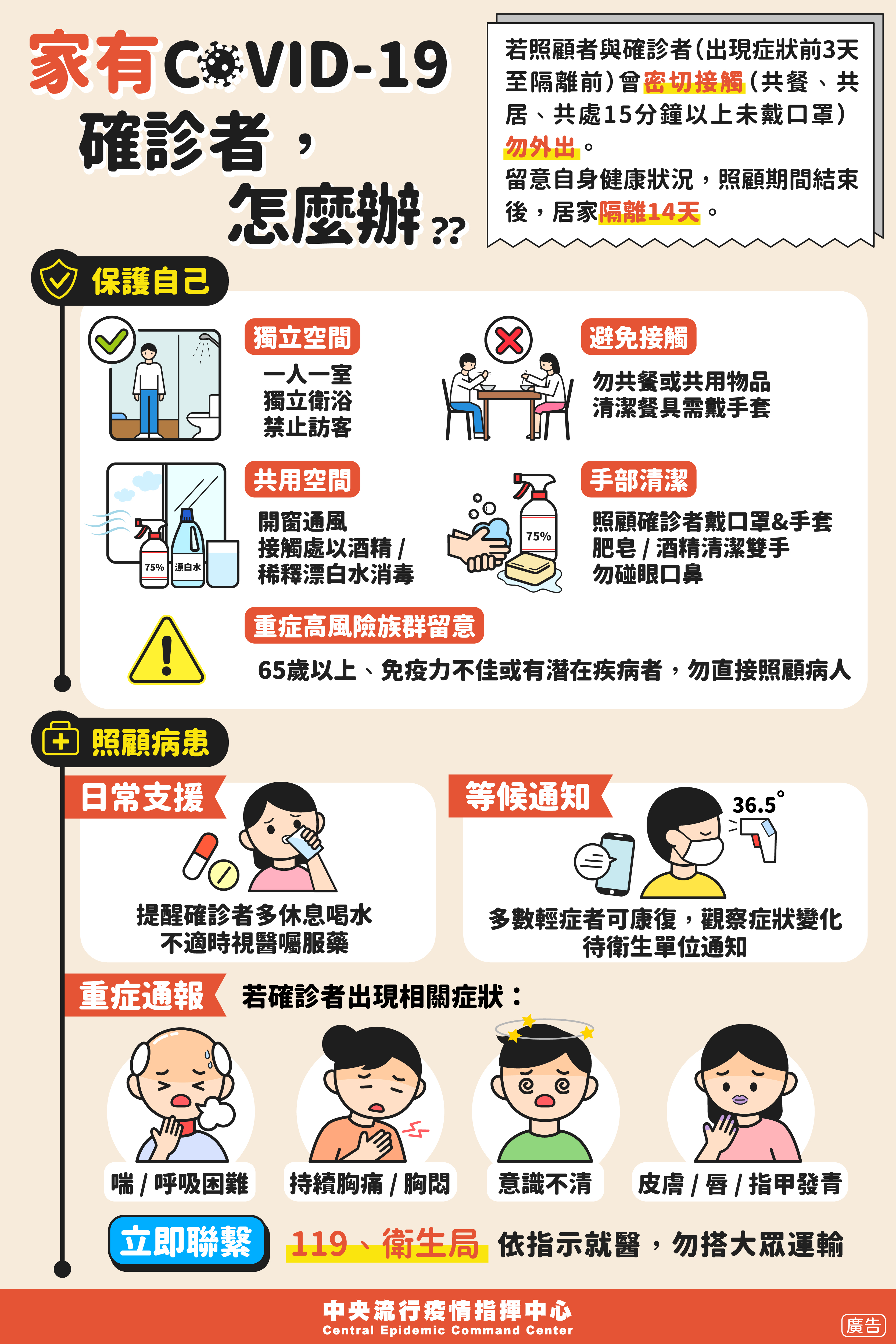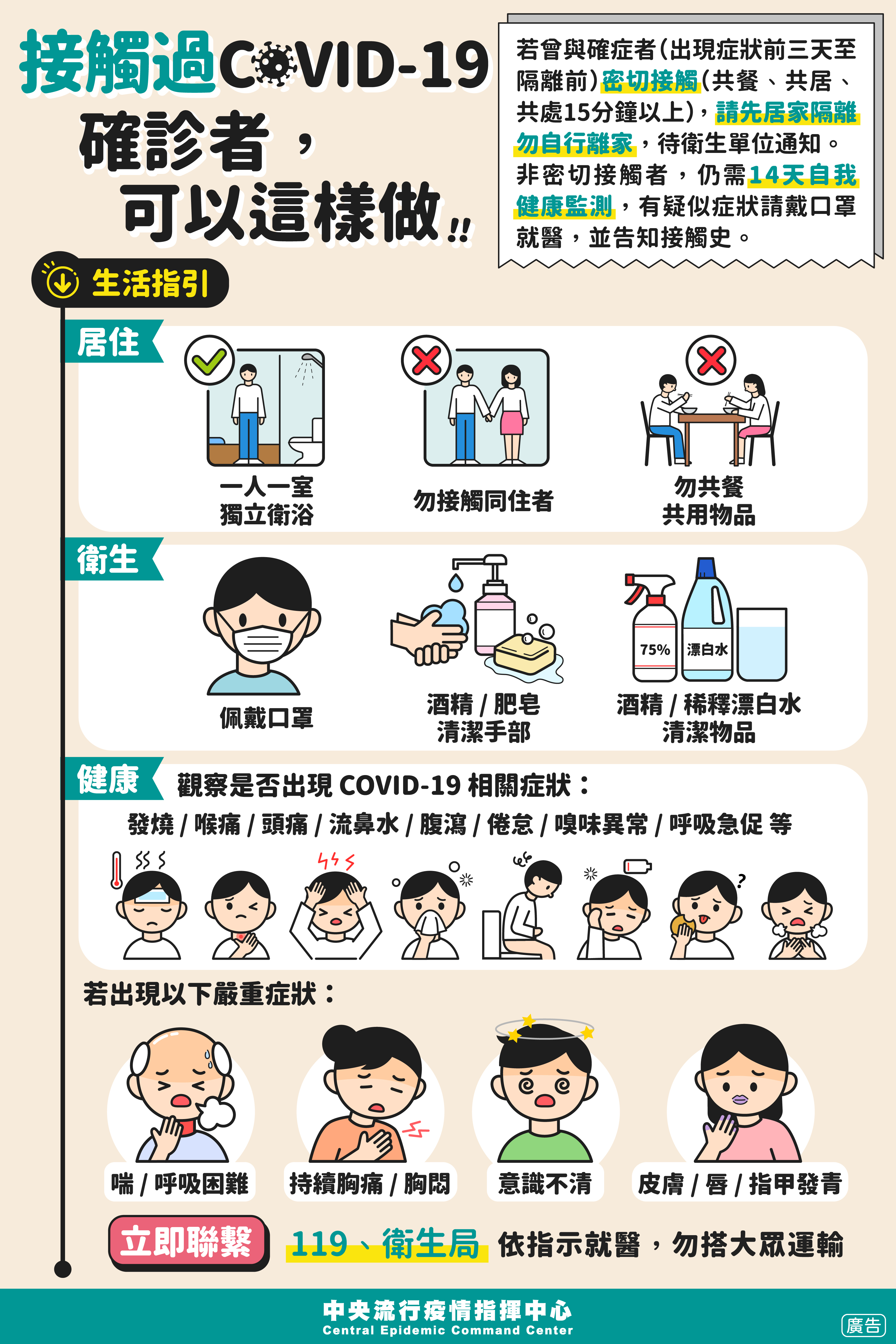 【轉知】中央流行疫情指揮中心-家有COVID-19確診者,怎麼辦?/接觸過COVID-19確診者,可以這樣做!!/確診COVID-19確診者,可以這樣做!!