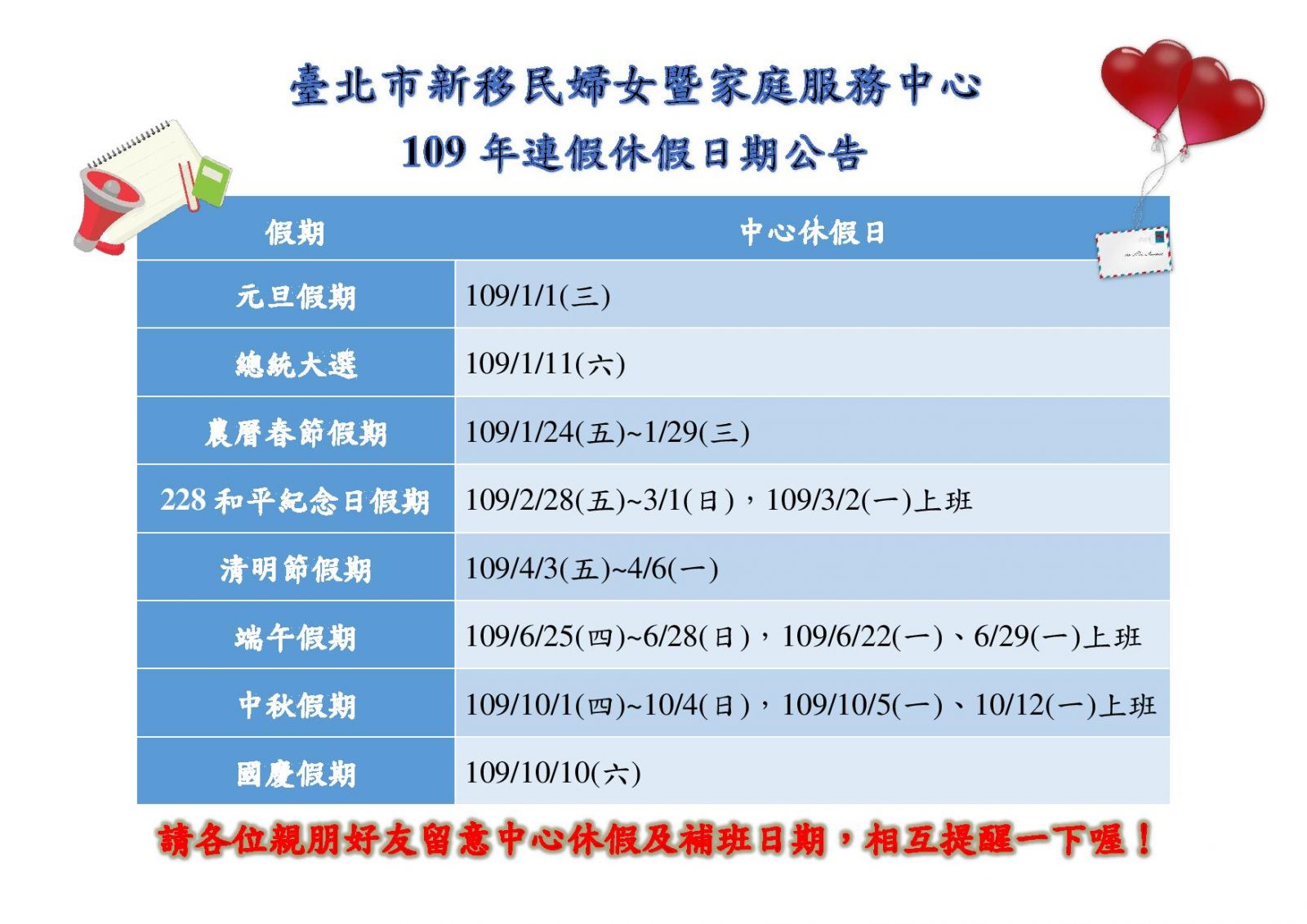 109年新移民中心連假休假暨補班日期出來囉! 請各位親朋好友留意一下唷!