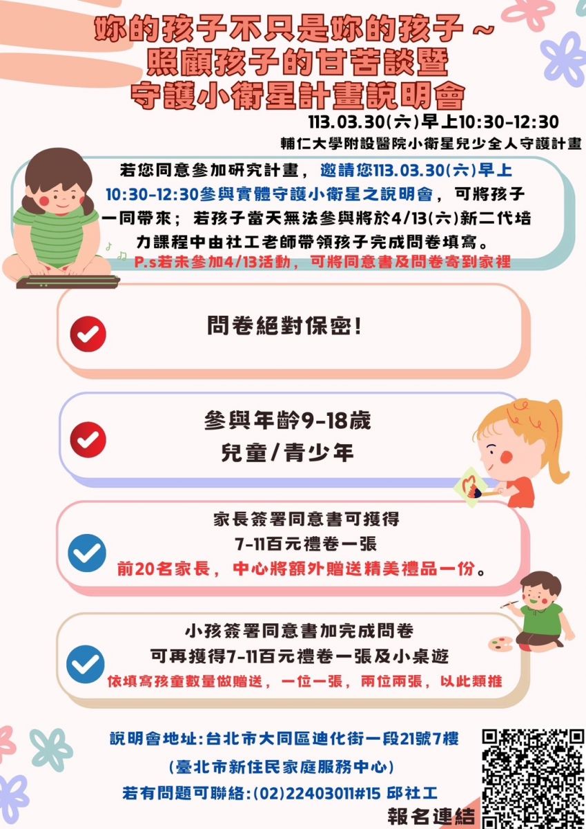 本中心與輔仁大學附設醫院兒少保中心一同合作小衛星兒少全人守護計畫,期望以醫學專業角度關注兒少身心健康與家庭社會關係,由問卷資料發覺孩子狀況,並給予適當協助,讓我們一同守護小衛星,願意加入此計畫之家長可填寫下方線上表單,此計畫無須任何費用,若有任何問題可與中心社工連絡,謝謝。