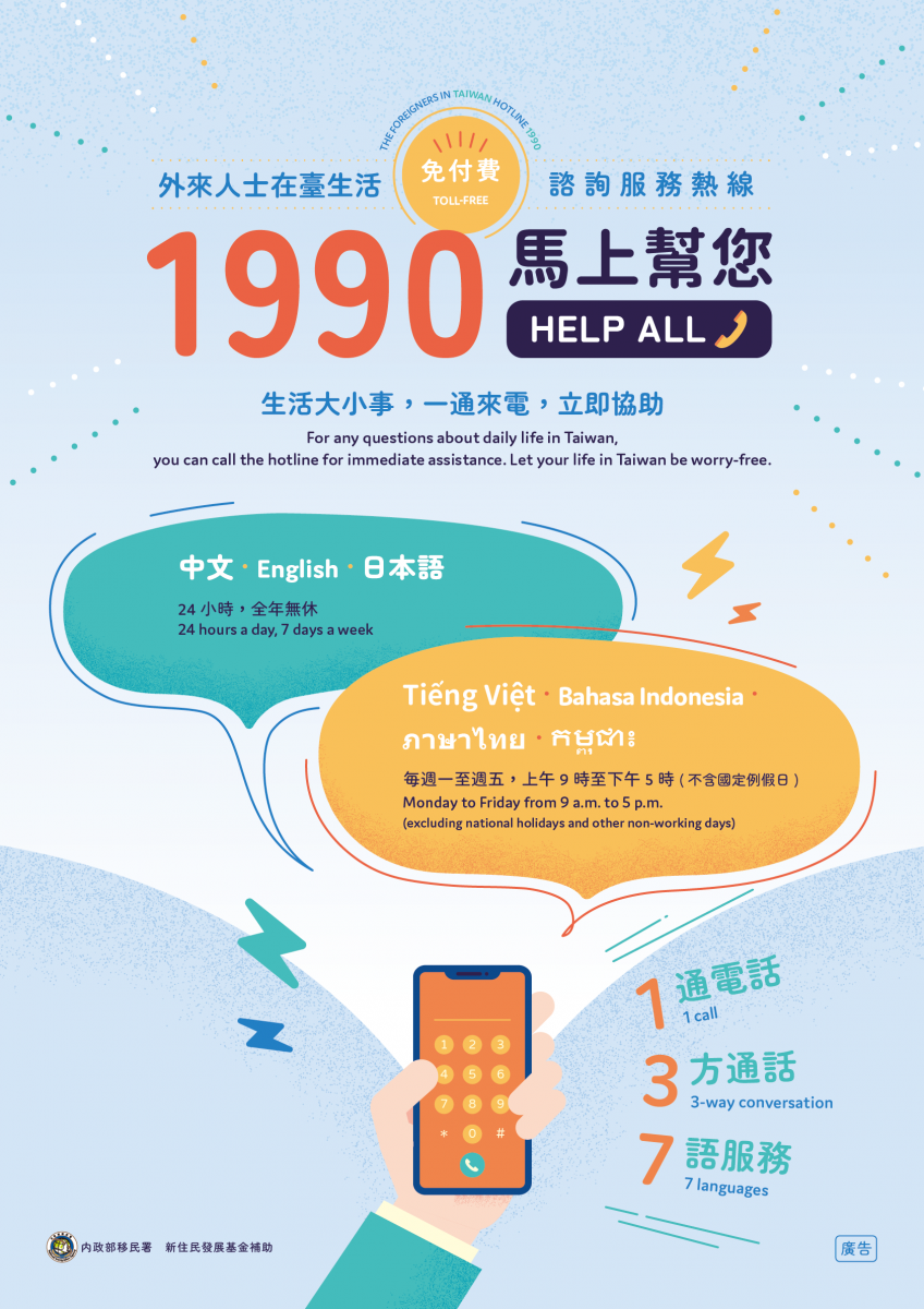 【轉知】內政部移民署-「外來人士在臺生活諮詢服務熱線」於7月1日起全面改碼為「1990」