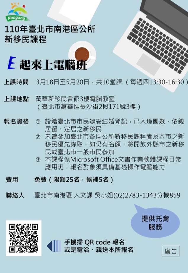 南港區公所於3月18日至5月20日,每周四下午13:30至16:30於萬華區新移民會館辦理新移民班E起來上電腦班,歡迎新移民朋友參加,詳情請至南港區公所網站查詢或電洽27831343分機859人文課吳小姐。