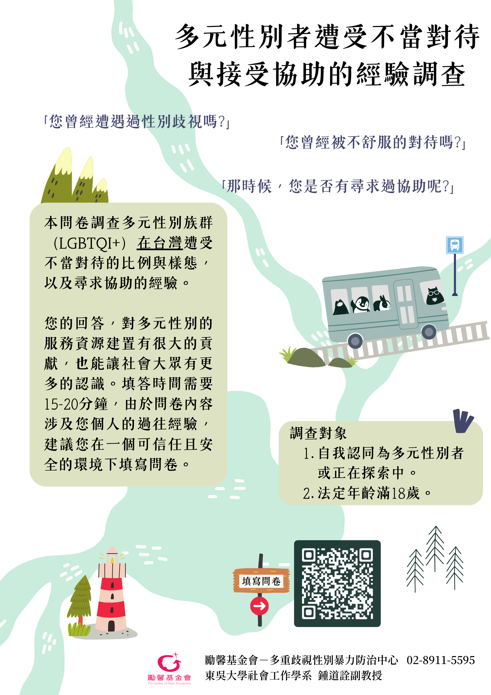 為更全面了解臺灣多元性別族群(LGBTQI+)遭受歧視、暴力或其他不當對待的經驗,以及其使用公共資源與尋求協助的情形,勵馨基金會「多重歧視性別暴力防治中心」與東吳大學社會工作學系鍾道詮副教授合作辦理問卷調查,希望透過蒐集真實經驗,作為未來政策倡議與服務改善的重要參考。