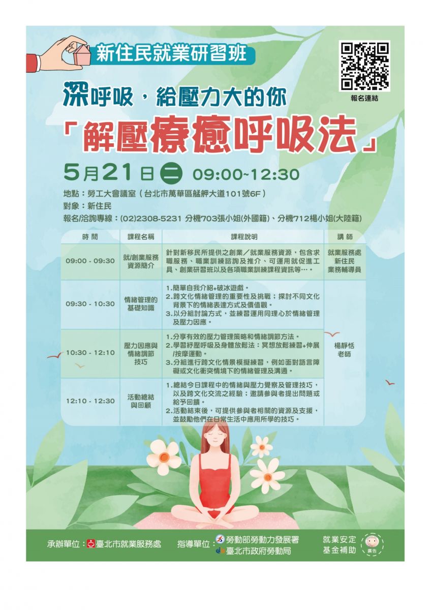 【轉知】臺北市就業服務處-新住民就業研習班】解壓療癒呼吸法