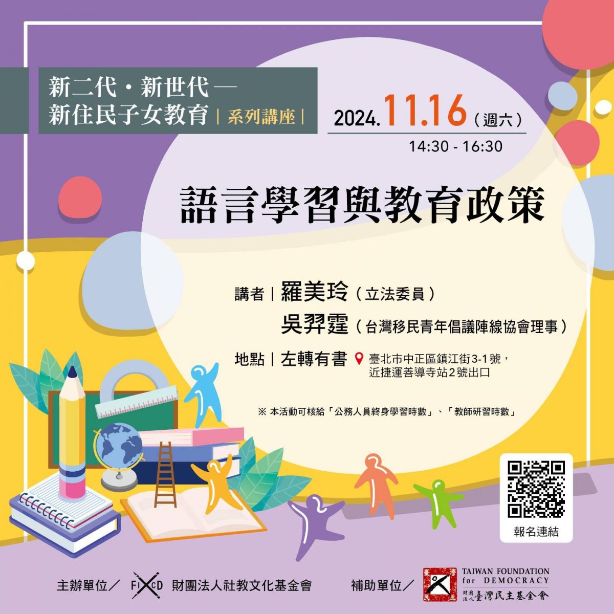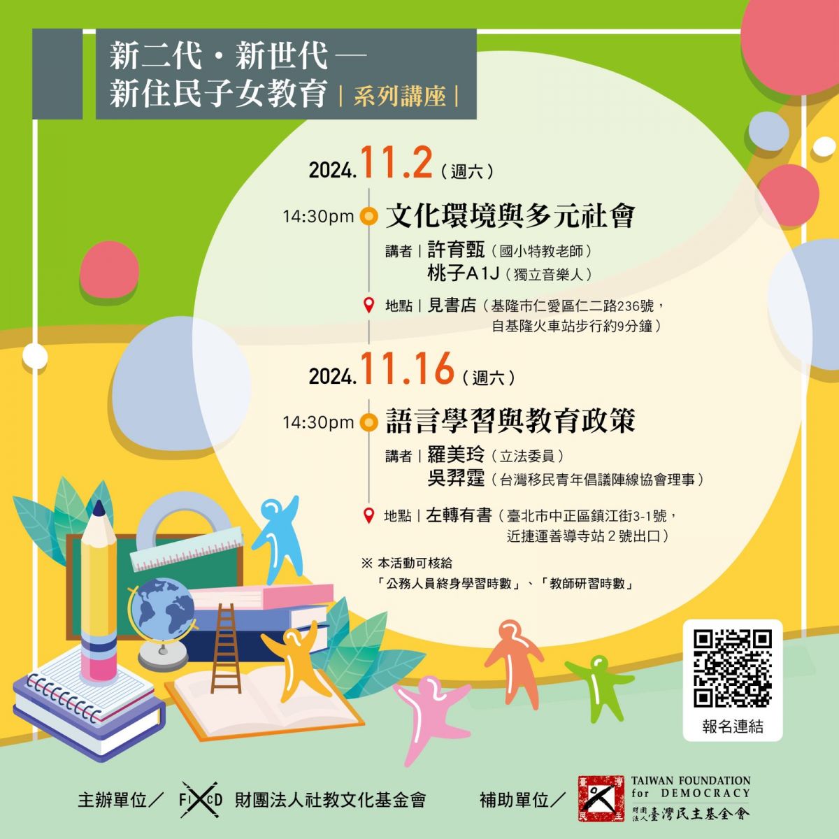 為此,2024年【新二代‧新世代-新住民子女教育系列講座】,邀請到來自不同家庭、成長求學背景的新二代夥伴,以不同的視角,分享她們的藝術創作、文化參與及社會互動經驗;同時,我們也邀請到參與公共事務的政治工作者、於教學現場的教師,分享她們新住民教育立法、政策推動、母語教學(學習)的觀察。