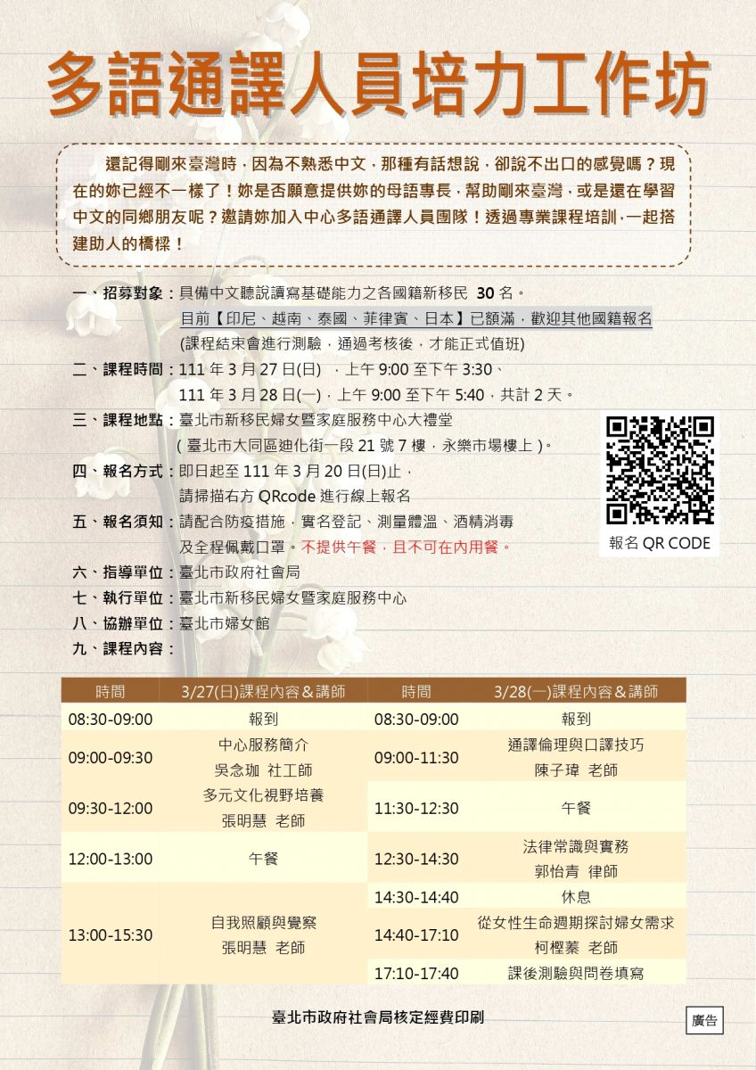 還記得剛來臺灣時,因為不熟悉中文,那種有話想說,卻說不出口的感覺嗎?現在的妳已經不一樣了!妳是否願意提供妳的母語專長,幫助剛來臺灣,或是還在學習中文的同鄉朋友呢?邀請妳加入中心多語通譯人員團隊!透過專業課程培訓,一起搭建助人的橋樑!