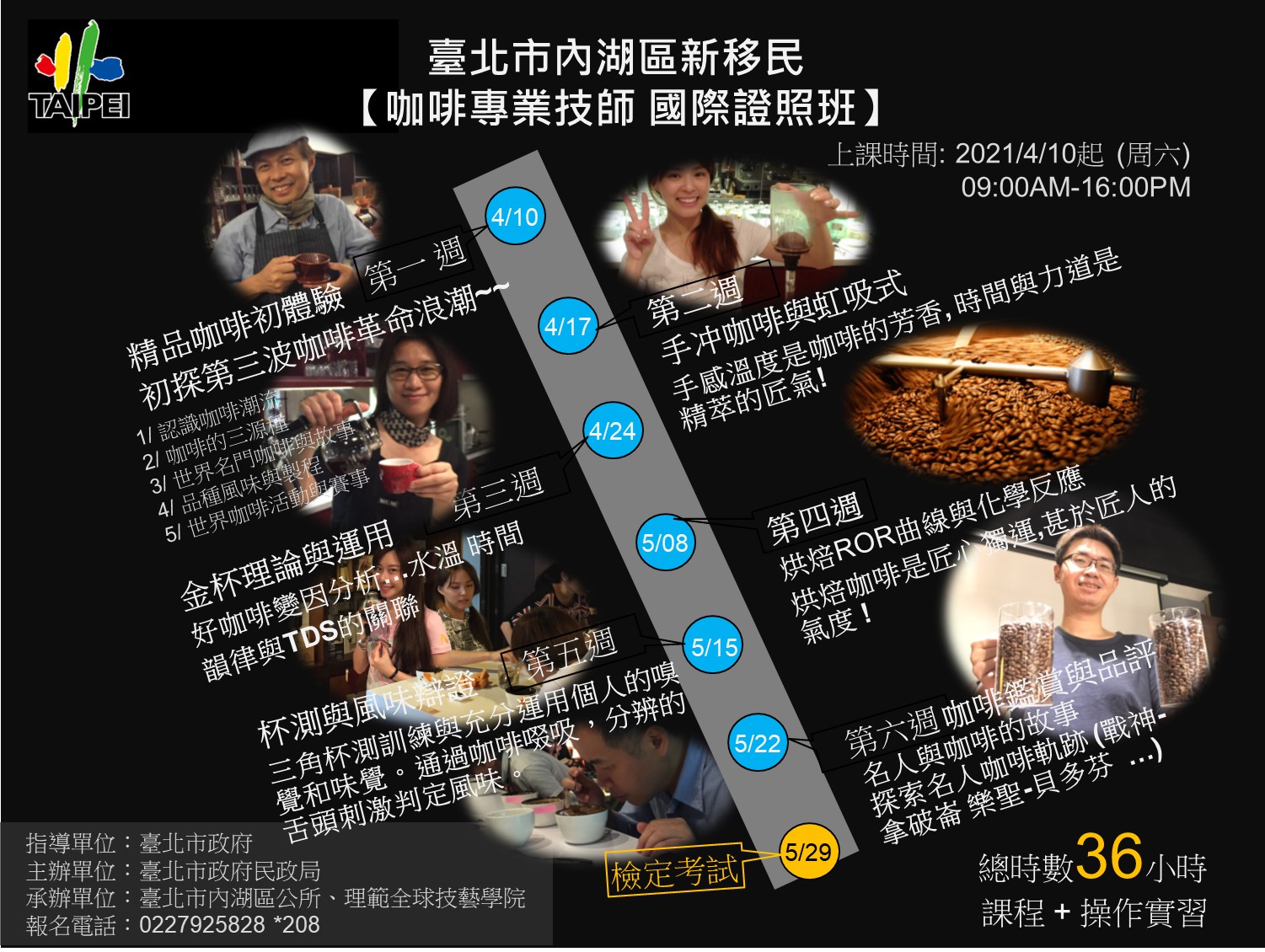 臺北市內湖區公所將於110年4月10日至110年5月22日(5月1日不上課),每週二上午9時至12時及下午1時至4時,於理範全球時尚技藝學院(臺北市內湖區民權東路6段296巷103號)開辦『110年度新移民金舌頭咖啡鑑賞師』,歡迎新移民踴躍報名參加,詳情請見內湖區公所網站新移民專區(