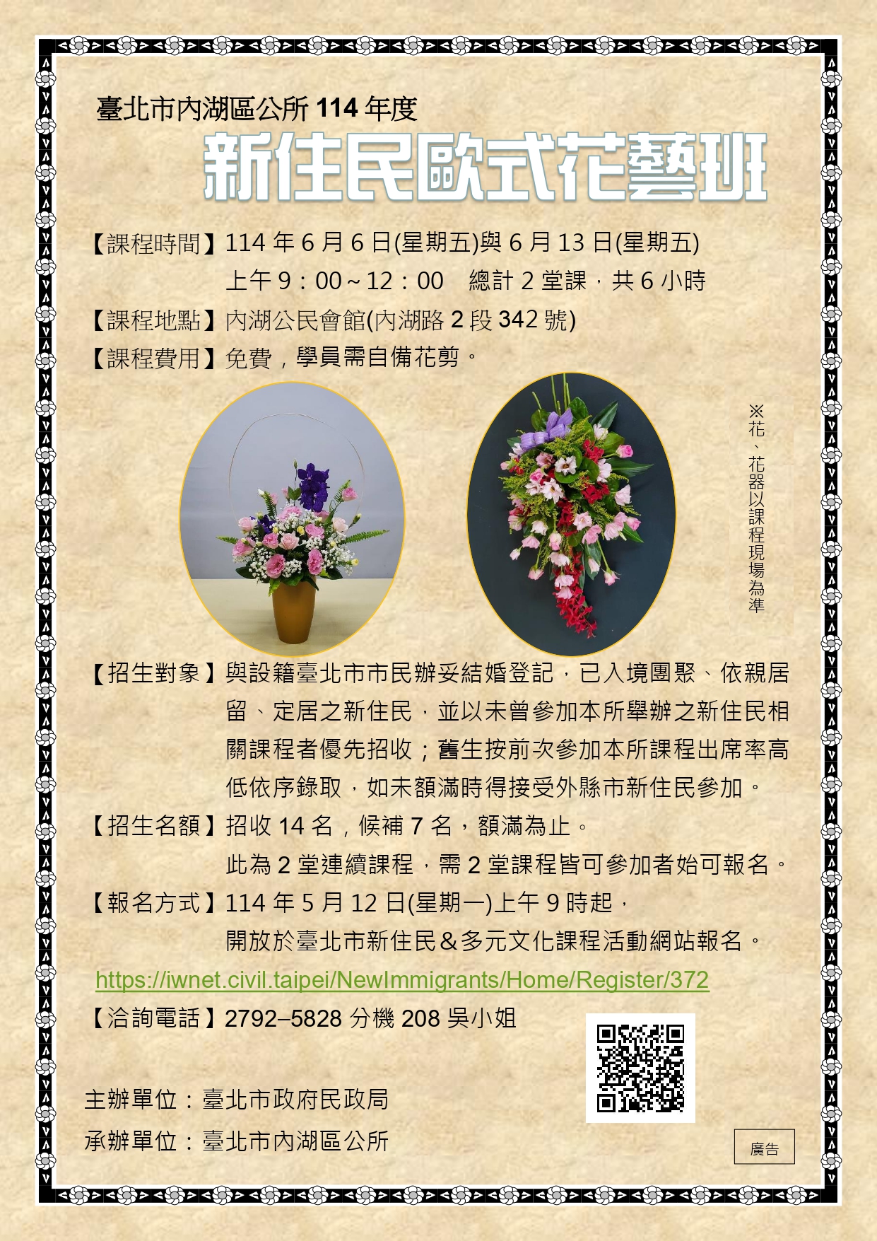 【轉知】內湖區公所-新住民歐式花藝班